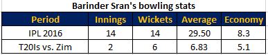 Barinder Sran was subject to the same treatment from the Indian selectors. He had a decent IPL 2016 and saw him making the Indian squad for a series against Zimbabwe later. Once the series got over, he did not get a single game.