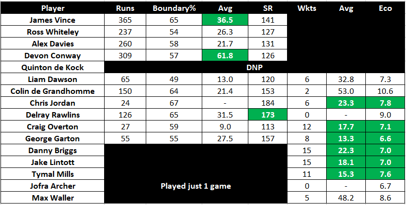 5) The entire Sussex bowling contingent has been on fire. Delray Rawlins, George Garton, and Chris Jordan have also chipped in with some very quick runs in the campaign. While Garton may not be seen by many as an all-rounder, he is actually more than capable of striking the long ball. He was utilized as a pinch-hitter at #3 under Jason Gillespie a couple of years back.