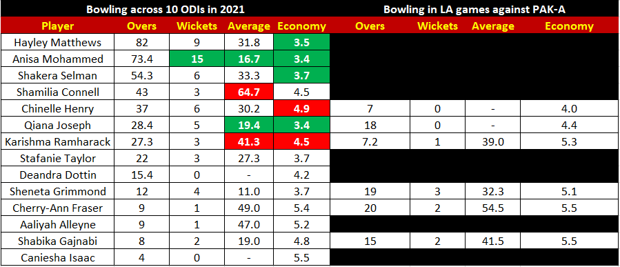 But, I’d like to shed some light on the pacers via the table below. The experienced duo of Shamilia Connell & Shakera Selman found it hard to pick wickets. This led to more new pacers entering the picture frame. Basis – LA games against PAK-A?