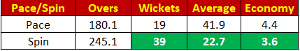 Now, let’s have a look at the Pace vs. Spin stats. Again, the struggle in their pace department is very obvious thus justifying the 8 different pacers they used in a short span.