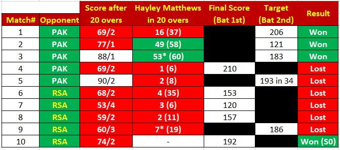 Or, look at the score at the 20-over mark when they batted first. All they have managed are scores ranging from 53-74 & that’s ridiculously low. This can be validated by the fact that they were bundled out on each occasion for a low score.