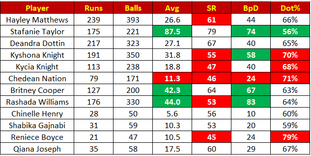 Look at the SR of Matthews & Dottin. They’ve taken a hit! Two batters who are immensely capable of winning it single-handedly have SR in the 60s with a high dot ball%.